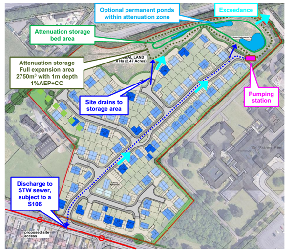 - Control the flow rate exiting the SuDS attenuation scheme via a suitably designed pumping station with a rate controlled to a maximum to be agreed with the Local Lead Flood Authority.